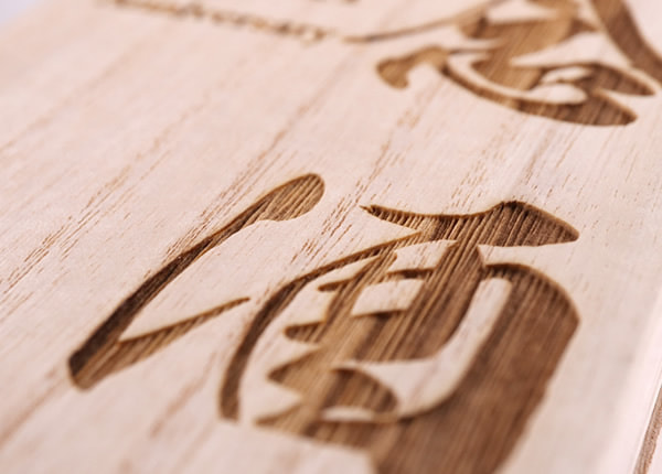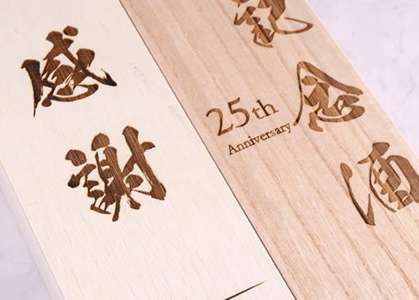 ご希望のオリジナルイラスト、ロゴ、文字などを微細なレーザー光線で彫りあげます。お箱の素材は桐箱かファルカタ材をお選びいただけます。ご注文の際に桐箱かファルカタ材どちらかをご指定くださいませ。見た目の違いは桐箱の方には木目があり、ファルカタ材にはございません。またお値段は桐箱の方が高くなります。風合いや重量に違いがございますので用途やご予算に合わせてご選択ください。なお、弊社でもテンプレートを何種類かご用意しております。